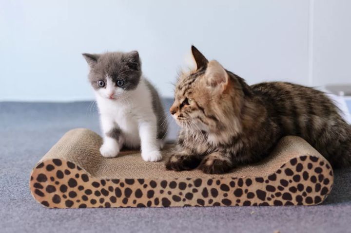 克隆猫大蒜刚出生1个月,它与代孕妈妈在一起。